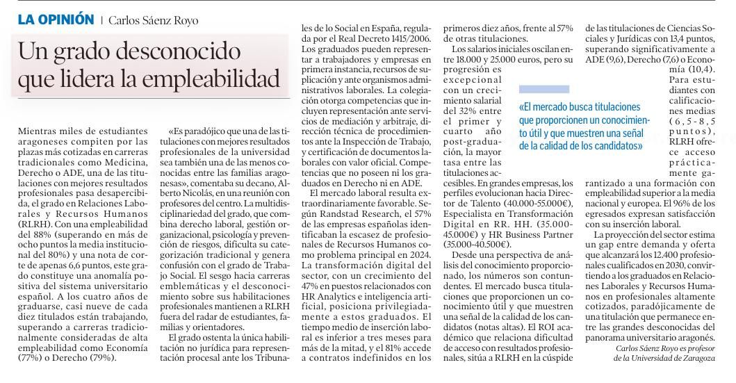 El profesor Carlos Sáenz Royo reflexiona en Heraldo de Aragón sobre el Grado en Relaciones Laborales y Recursos Humanos (GRLRH), una de las titulaciones con mayor empleabilidad del sistema universitario español (88%) y una nota de corte creciente.